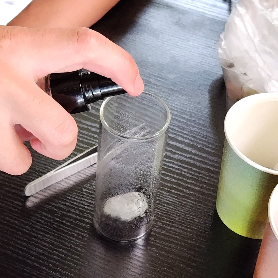土を入れたら霧吹きで湿らせて、さあピンセットで植え付け開始です!
